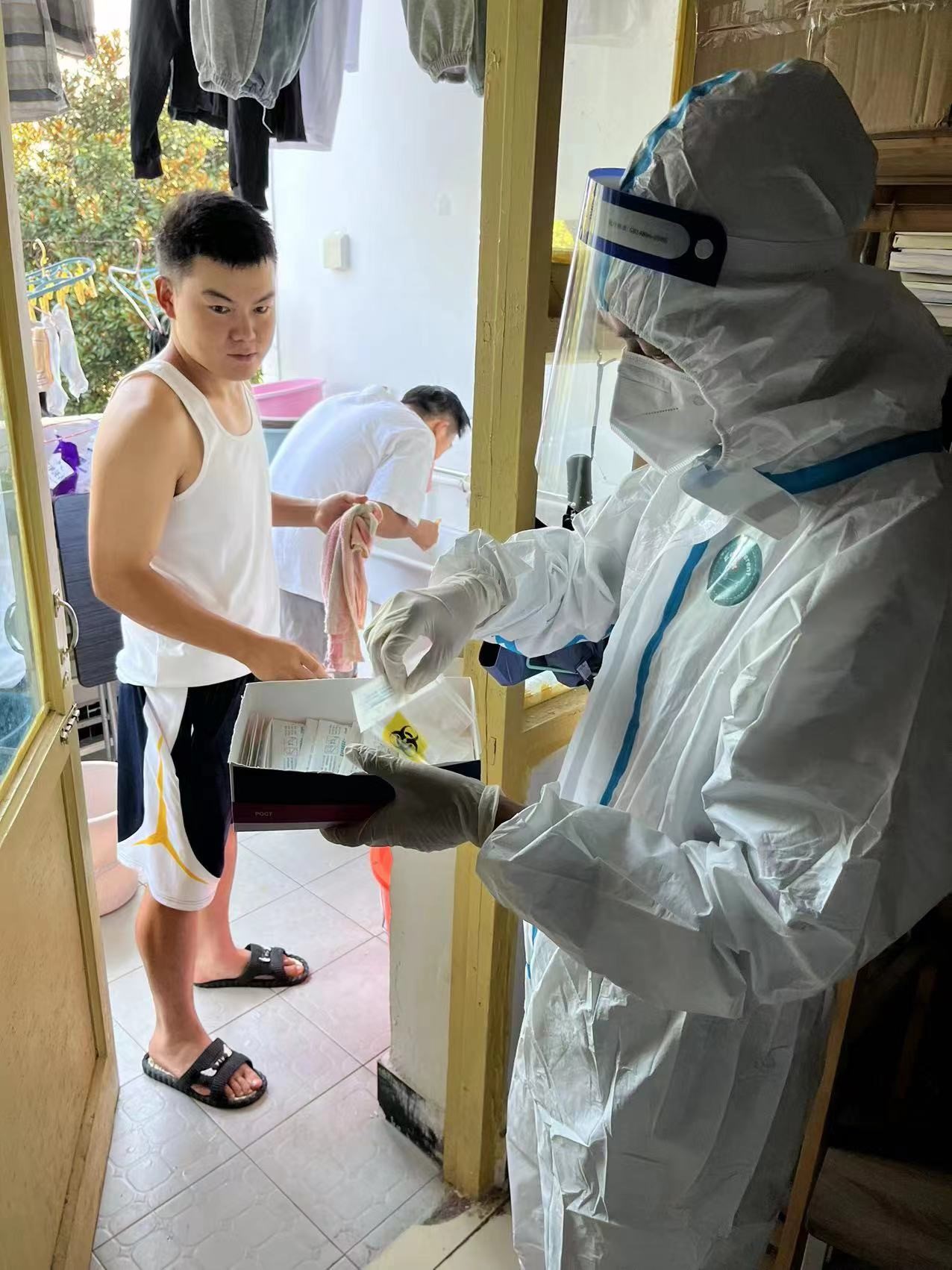 邹江河老师在员工寝室中发放抗原自测检测试剂