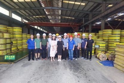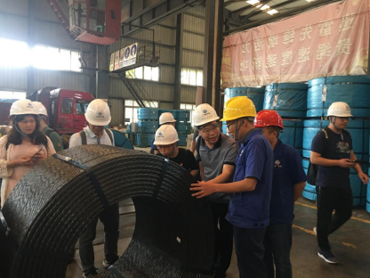 座谈会后,在梁总的带领下,吴家福副经理一行到生产车间进行参观。在生产车间,看到钢材在拉丝、绞股、热处理等一道道工序最后打包成一捆捆的成品,公司教师们就关注的问题与车间现场师傅进行交流,并留下联系方式以便进一步深入交流。