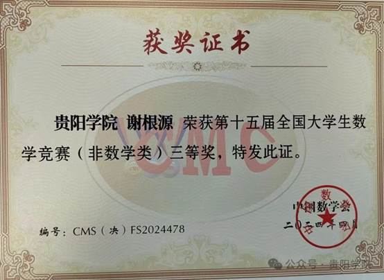 williamhill英国官网对谢根源同学的获奖表示热烈祝贺,并希望全体同学能够以他为榜样,努力学习,积极参与各类学科竞赛,不断提升自己的综合素质和创新能力。同时,公司也将继续加强学科的建设和发展,为培养更多具有创新精神和实践能力的人才做出积极贡献。